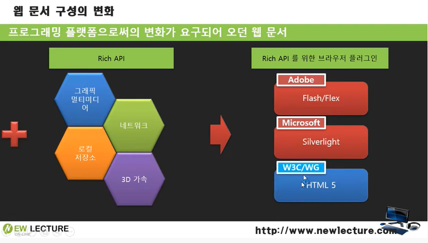 화면 내에서 HTML 기반으로 3D 기능, 멀티미디어을 구현하는 화면 기술과 이를 보완하는 API 기타 등등을 연구하게 됩니다. 즉, 웹 문서에 Rich API (그래픽 멀티미디어, 네트웤, 3D 가속, 로컬 저장소) 등이 합쳐지게 됨. Rich API를 위한 브라우저 플러그인(Adobe의 Flash/Flex, MS의 SilverLight) 등을 원래는 다운받아 설치해야 쓸수 있는 플러그인이었는데, 위와 같은 연구를 통해 HTML5 는 브라우저 자체에서 제공하게 되죠.